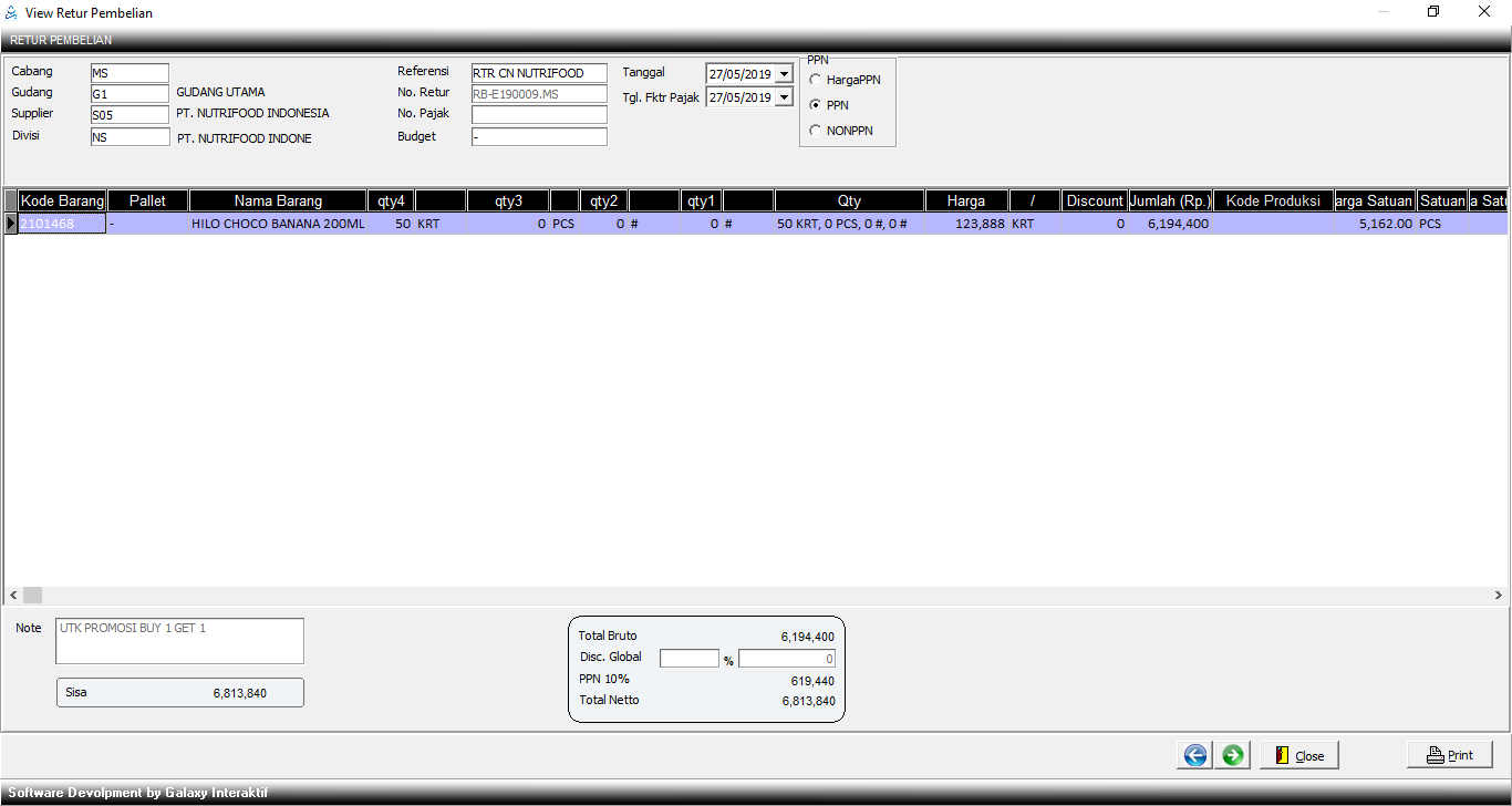 Retur pembelian merupakan pengembalian barang yang telah dibeli oleh distributor ke supplier, biasanya dikarenakan barang yang dibeli rusak/cacat/tidak sesuai dengan pesanan. Walaupun setelah menginput jumlah retur ini sudah mengurangi persediaan, namun belum mengurangi hutang karena belum dapat dipastikan apakah retur tersebut akan diganti dengan barang lagi ataukah diberikan dalam bentuk Nota Debet yakni untuk mengurangi total hutang ke supplier. Tanpa memotong hutang pembelian, jika belum di panggil di menu pembayarann hutang.
