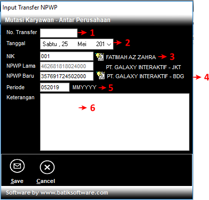 3 | NIK | Klik 2x untuk mengambil kode karyawan yang akan di transfer, otomatis muncul NPWP Lama |