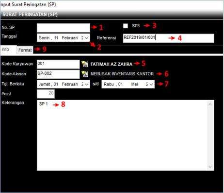 Jika terdapat karyawan yang melakukan pelanggaran sesuai dengan peraturan perusahaan harus dibuatkan surat peringatan, maka user dapat menginput pada menu ini. Surat Peringatan dibuat dengan memuat tanggal berlakunya surat peringatan, jika dalam masa berlakunya SP yang pertama karyawan melakukan pelanggaran lagi maka dibuatkan SP yang kedua dan seterusnya sampai ketiga. Namun jika karyawan melakukan pelanggaran berat yang mengharuskan untuk langsung mendapatkan SP3, maka alasan yang diambil adalah Alasan SP yang kolom SP3 sudah di checklist.
