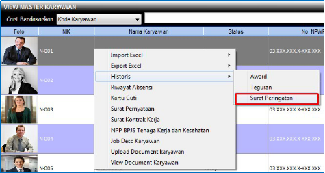 2. Maka tampil jendela View Master Karyawan, pilih kode karyawan yang histori sp nya akan ditampilkan kemudian klik kanan dan pilih Histori -> Surat Peringatan.