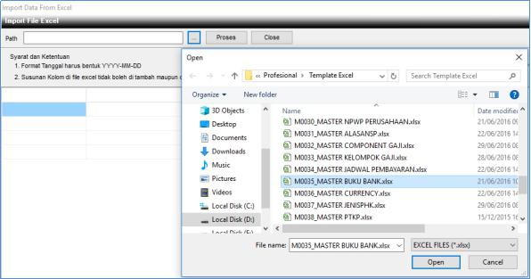 3. Maka muncul jendela Import File Excel,  pilih  elipsis untuk mengambil file yang akan diimport dengan nama file M0035_MASTER BUKU BANK.xlsx (harus ada di folder Template Excel).