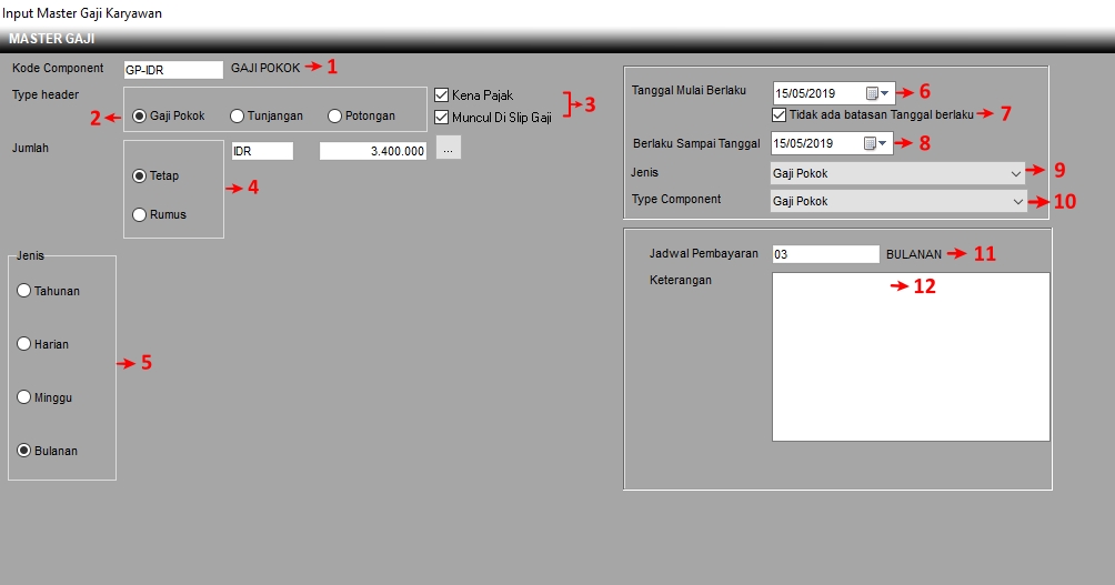 5 | Jenis | Pilih jenis pembayaran component Tahunan/Harian/Mingguan/Bulanan |
