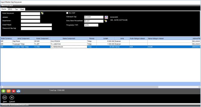 Menu ini digunakan untuk menginput gaji tiap karyawan dengan mengambil data dari Kelompok Gaji. Pada menu ini juga user dapat mengatur keikutsertaan BPJS karyawan dan perhitungan THR. Setelah data Kelompok Gaji ditarik, user bisa mengubah nilain komponen dan data lain berkaitan dengan komponen gaji.