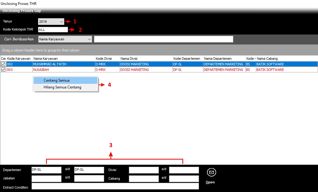 3 Departemen/ Jabatan/ Divisi/ Cabang/ Extract Condition Klik 2x untuk mengambil kode Departemen/ Jabatan/ Divisi/ Cabang/ Extract Condition untuk memfilter kode karyawan yang akan ditampilkan  kemudian klik Open