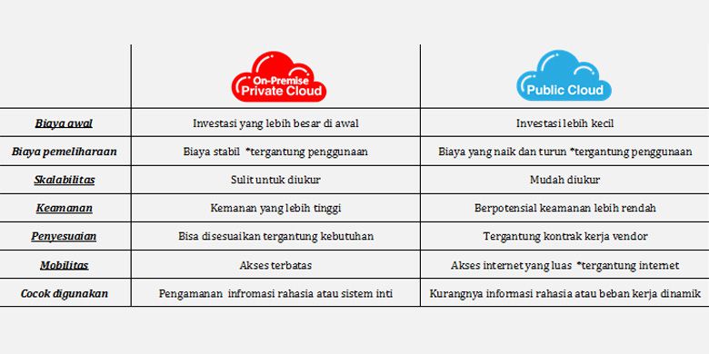 Penggunaan cloud dijadikan fokus oleh perusahaan-perusahaan. Misalnya saja seperti startup di bidang e-commerce yang saat ini tengah menjamur di Indonesia, layanan transportasi berbasis aplikasi online, hingga perusahaan-perusahaan yang kebutuhan penyimpanan datanya besar seperti perbankan. Penggunaan cloud, jika dibandingkan dengan pusat penyimpanan data yang bersifat on premise, memang menawarkan beberapa kelebihan. Penggunaan cloud memungkinkan perusahaan memangkas investasi besar di awal untuk penyediaan perangkat penyimpanan data. Namun, keputusan untuk migrasi ke cloud pada kenyataannya tidak boleh dibuat dengan pertimbangan biaya yang lebih murah saja, atau bahkan karena pertimbangan penggunaan cloud sedang menjadi tren saat ini. Ini karena cloud juga tidak bisa dijadikan sebagai solusi untuk semua persoalan terkait penyimpanan data. Oleh karena itu, sebelum memutuskan tetap menggunakan pusat data on premise atau cloud perusahaan harus menelaah terlebih dahulu kesesuaiannya dengan model, struktur desain perusahaan, serta kebutuhan bisnis perusahaan ke depannya. Nah, sebagai bantuan pertimbangan mari kita bandingkan kelebihan dan kekurangan antara cloud dengan pusat data on premise.