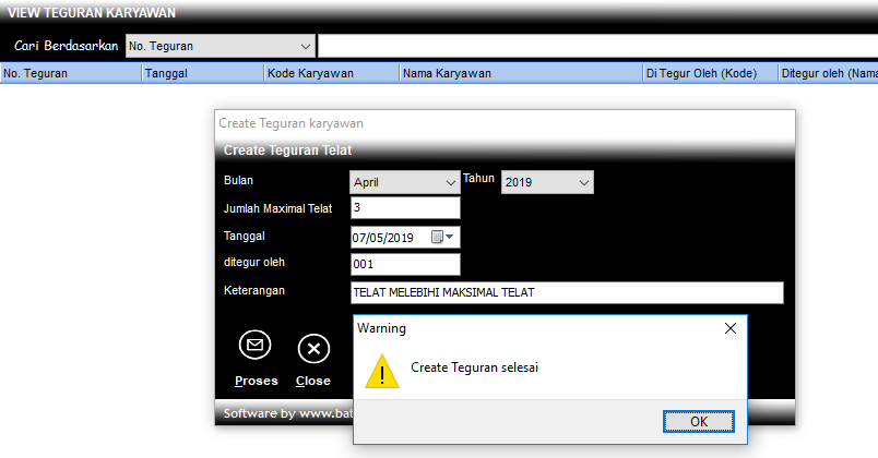Pada fitur ini, Anda dapat membuat teguran untuk karyawan. Teguran ini dimaksud agar karyawan patuh terhadap peraturan dan tata tertib perusahaan. Selain itu, fitur ini juga dapat digunakan untuk membuat teguran terhadap karyawan-karyawan yang terlambat masuk melebihi maksimal jumlah hari terlambat dalam 1 periode secara otomatis.