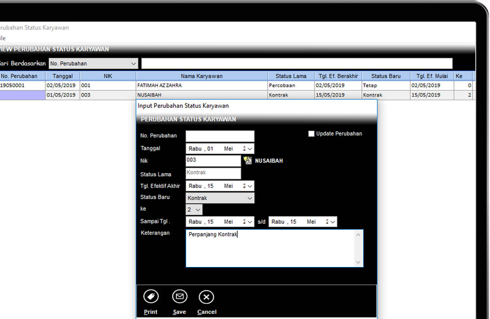 Fitur Perubahan Status Karyawan berfungsi untuk mengubah status karyawan ataupun memperpanjang status. Misal mengubah status karyawan kontrak menjadi karyawan tetap, atau memperpanjang kontrak. Adanya fitur ini membantu perusahaan apabila sewaktu-waktu membutuhkan data riwayat status pekerjaan karyawan.