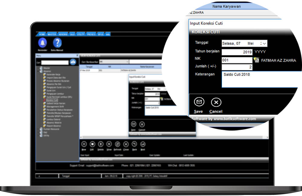 Koreksi Cuti ini berguna untuk melakukan mutasi terhadap saldo cuti baik menambah maupun mengurangi. Pada Batik Profesional, saldo cuti tahun lalu tidak akan terakumulasi secara otomatis ke tahun berikutnya. Sehingga melalui menu ini, Anda dapat melakukan koreksi saldo cuti.