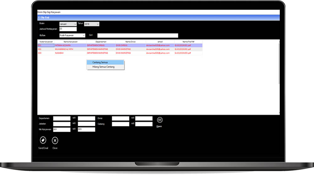 Adanya E-Slip Gaji, membuat pekerjaan menjadi lebih cepat karena hanya satu kali klik slip akan terkirim ke masing-masing e-mail karyawan. E-Slip juga membuat pekerjaan lebih paperless serta aman dari kebocoran data gaji antar karyawan yang dapat menimbulkan kecemburuan. E-Slip tersebut dilengkapi dengan password, default adalah tanggal lahir masing-masing karyawan namun Anda bisa mengubah password secara custom.