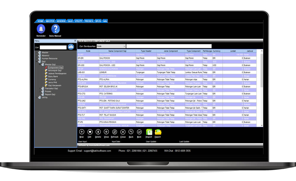 Anda dapat membuat komponen gaji hingga tak terbatas, ini membantu apabila masing-masing karyawan ingin dibedakan komponen gajinya. Pada masing-masing komponen juga dapat diatur, apakah dibayar bulanan atau mingguan. Untuk mengefisiensikan waktu dalam menginput komponen, Batik Profesional menyediakan import data komponen melalui excel yang templatenya sudah kami sediakan.