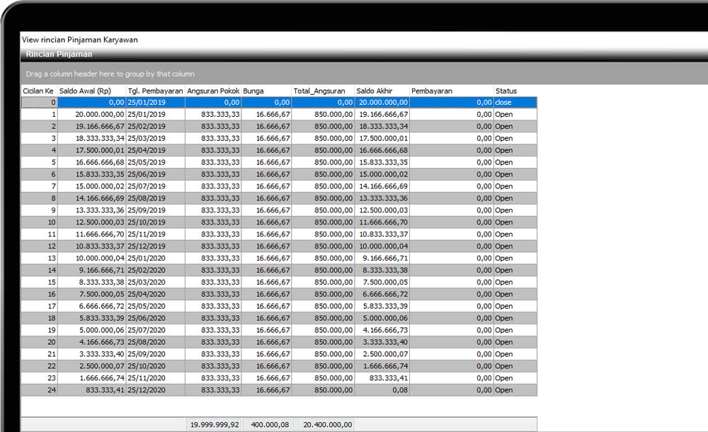 Pada pinjaman ini, Anda juga dapat menambahkan bunga dalam bentuk presentase per tahunnya. Pembayaran atas pinjaman dapat dilakukan dengan 2 cara, yaitu melalui proses gaji yang otomatis akan memotong gaji karyawan dan pembayaran yang input manual. Pada fitur ini, Anda dapat menampilkan rincian atas masing-masing pinjaman karyawan.