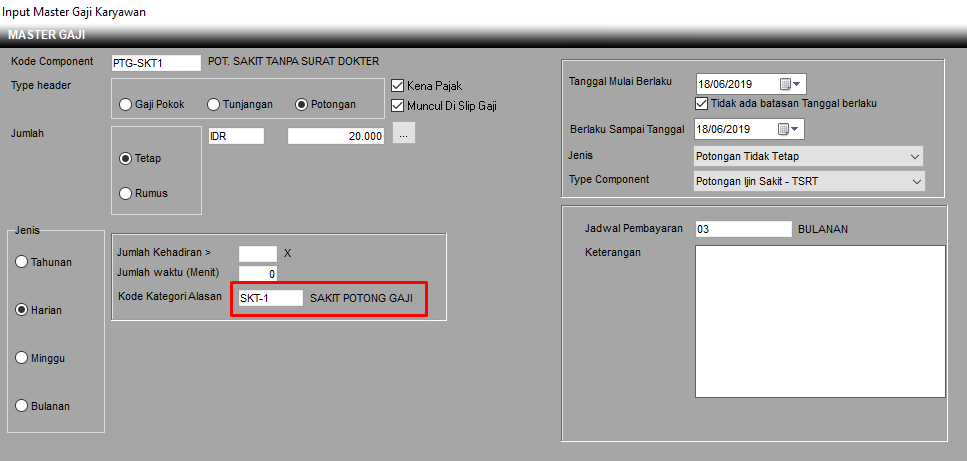 Untuk Potongan Alpha dan Potongan Izin, settingannya seperti ini tinggal diubah saja kode kategori alasan dan type componennya.