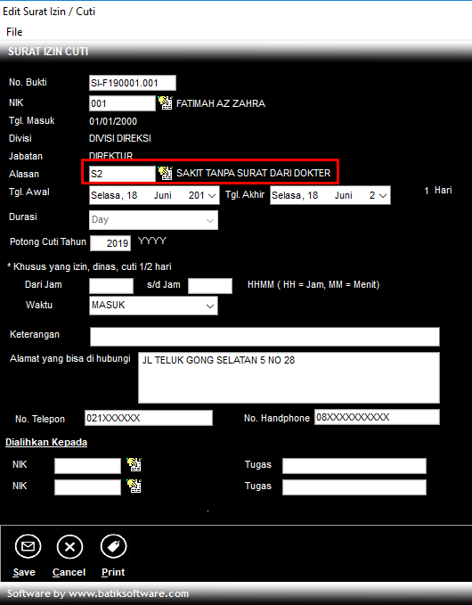 Maka setiap ada surat izin dengan alasan berkategori Sakit Potong Gaji, karyawan akan mendapatka potongan sebesar 20 ribu per tanggal kejadian.