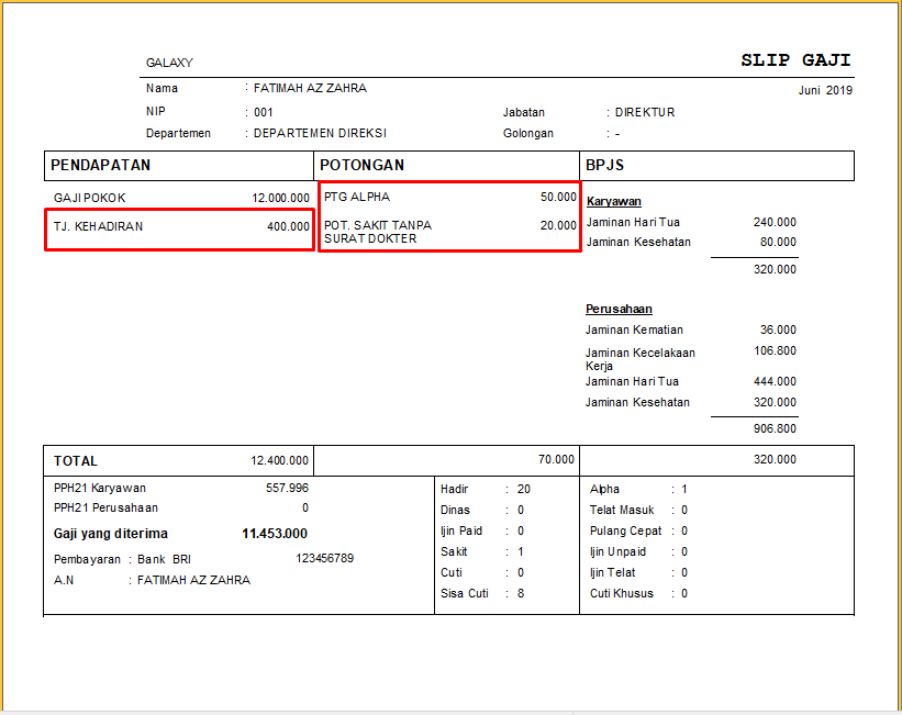 Berikut adalah penerapan insentif dan potongan berdasarkan kehadiran.