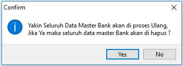 4. Klik Proses untuk mulai melakukan proses import, maka akan tampil pemberitahuan sebagai berikut. Pilih Yes untuk melanjutkan (seluruh data master Bank yang lama akan terhapus) atau No untuk membatalkan.