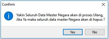 4. Klik Proses untuk mulai melakukan proses import, maka akan tampil pemberitahuan sebagai berikut. Pilih Yes untuk melanjutkan (seluruh data master Negara yang lama akan terhapus) atau No untuk membatalkan.
