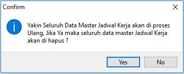 4. Klik Proses untuk mulai melakukan proses import, maka akan tampil pemberitahuan sebagai berikut. Pilih Yes  untuk melanjutkan (seluruh data master Jadwal Kerja yang lama akan terhapus) atau No  untuk membatalkan.