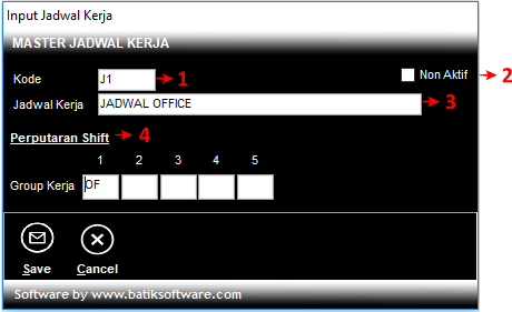 Menu ini digunakan untuk menginput jadwal kerja untuk karyawan dengan mengambil data group kerja (1 kode group kerja berisi waktu kerja dalam 1 minggu baik 1 shift/2shift) yang telah dibuat, menu jadwal kerja ini nantinya akan digunakan pada Master Data Karyawan sebagai penentu perputaran jam kerja/shift tiap karyawan. Batik Software menyediakan beberapa kolom pada Jadwal Kerja untuk menginput perputaran jadwal kerja tiap minggunya sesuai dengan group kerja yang diambil.
