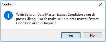 4. Klik Proses untuk mulai melakukan proses import, maka akan tampil pemberitahuan sebagai berikut. Pilih Yes  untuk melanjutkan (seluruh data master Extract Condition yang lama akan terhapus) atau No  untuk membatalkan.
