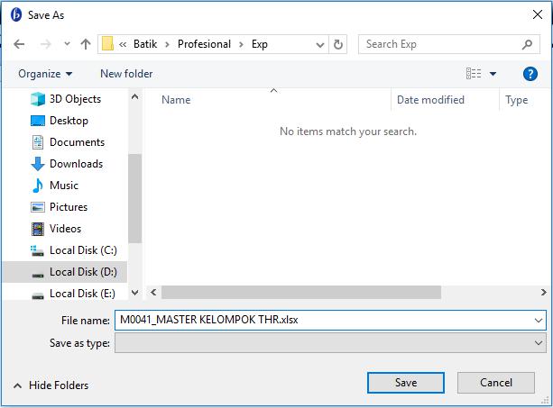 2. Maka muncul jendela untuk menyimpan file export, pilih folder kemudian isi nama file dan extention file kemudian klik Save untuk menyimpan.