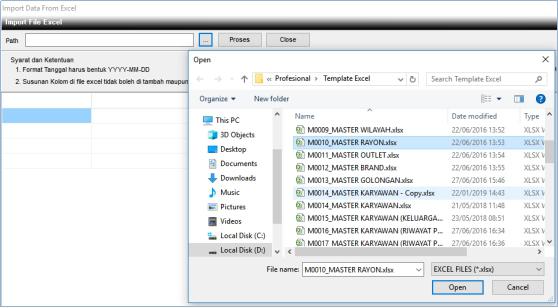 3. Maka muncul jendela Import File Excel,  pilih  Elipsis  untuk mengambil file yang akan diimport dengan nama file M0023_MASTER RAYON.xls (harus ada di folder Template Excel).