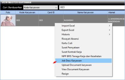 1. Buka Modul Master -> Karyawan -> Data Karyawan, pilih kode karyawan yang data job descnya akan ditampilkan kemudian klik kanan dan pilih Job Desc Karyawan.