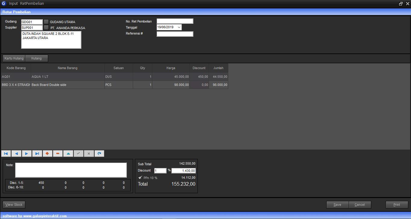 Total Muncul total retur barang yakni dari subtotal-discount+PPN10%