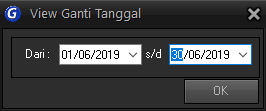 ** Ganti tanggal fungsinya untuk mengubah tanggal untuk menampilkan transaksi. Jika akan menampilkan transaksi tanggal 01/06/2019 s/d 30/06/2019, maka ganti tanggal diubah ke tanggal tersebut.