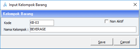 Barang dapat dikelompokkan menjadi beberapa bagian, menu Kelompok Barang ini adalah kelompok terbesar dari barang yang dapat dibagi lagi menjadi Sub Kelompok, kelompok barang ini nantinya akan dipakai pada menu sub kelompok.