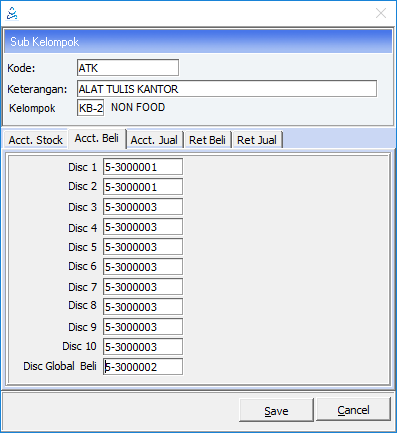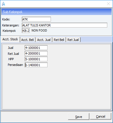 Sub Kelompok Barang ini memiliki beberapa tab untuk menginput perkiraan terkait transaksi atas barang dengan Sub Kelompok Barang tersebut.