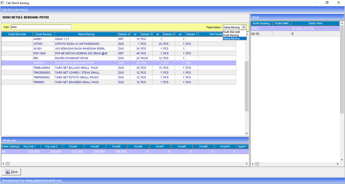 2) Bisa dilihat di baris bawah terdapat harga barang per cabang, disamping kanan ada jumlah stock per gudang.