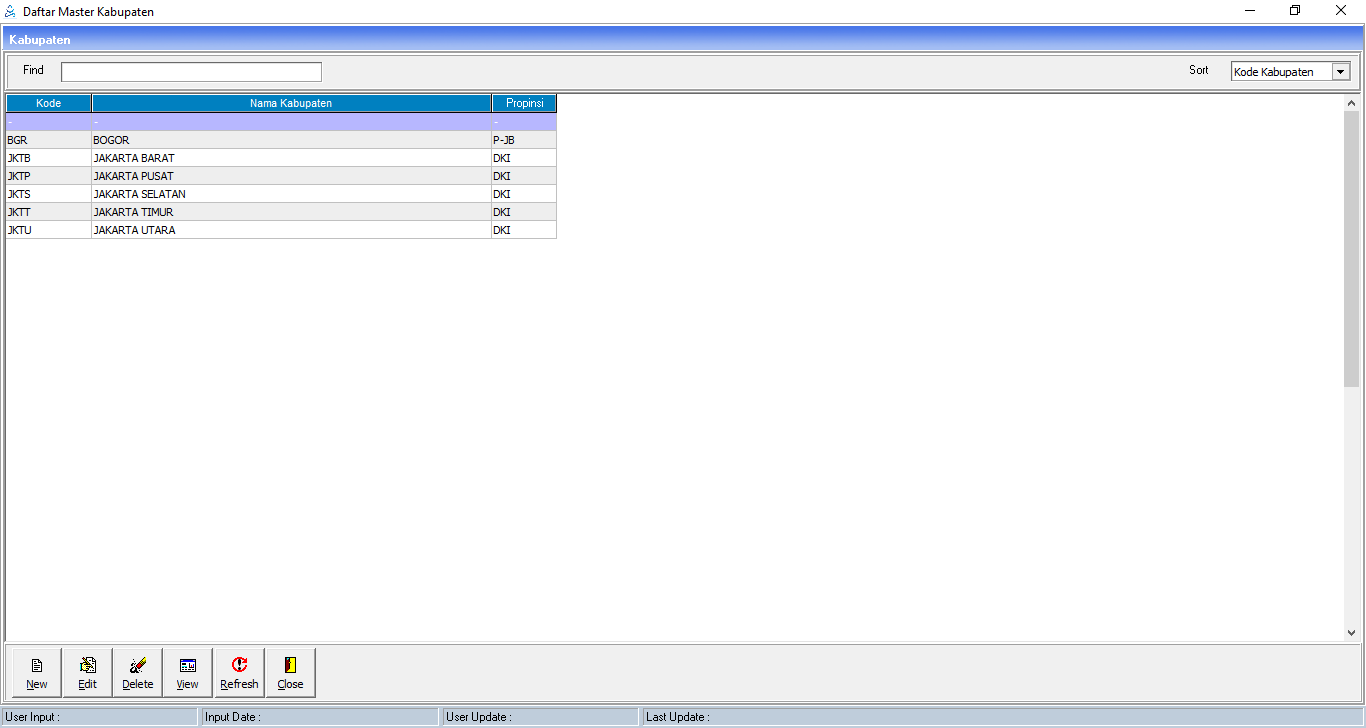 Kabupaten merupakan hierarki regional setelah propinsi, nantinya data kabupaten ini akan dipakai pada menu kecamatan.