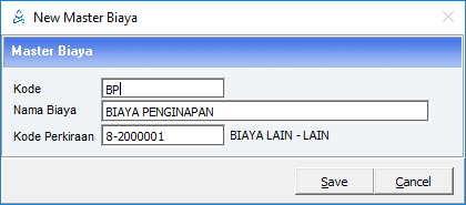 Biaya yang diinput dalam Master Biaya ini adalah biaya-biaya yang biasa dikeluarkan pada saat distributor melakukan kegiatan transaksi dimana biaya-biaya ini nantinya akan digunakan pada saat pelunasan piutang customer maupun pembayaran hutang ke supplier.