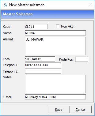 2. Master ini jangan dihapus jika sudah dipakai untuk data transaksi karena akan merusak data transaksi tersebut, jika salesman sudah  tidak digunakan lebih baik dinon-aktifkan saja.