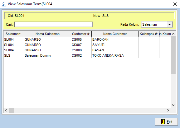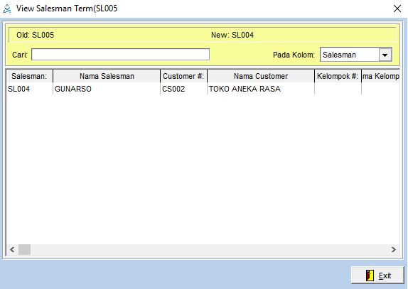 Memindahkan data customer salesman Tito ke salesman Gunarso yang sudah kosong.