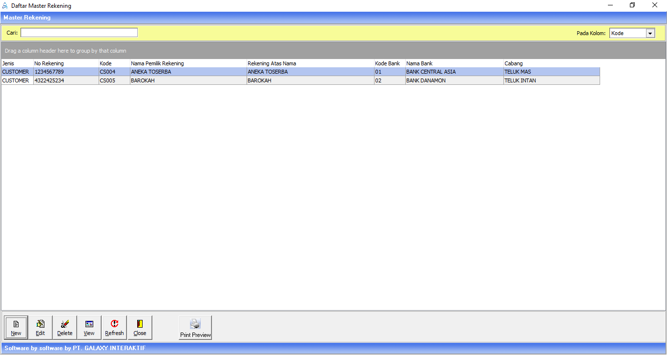 Kode Bank | Klik 2x kolom untuk mengambil data pada master bank. |