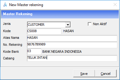 Jenis | Diisi pilihan data rekening diantaranya customer, supplier, atau karyawan. |