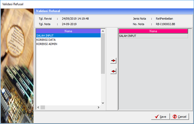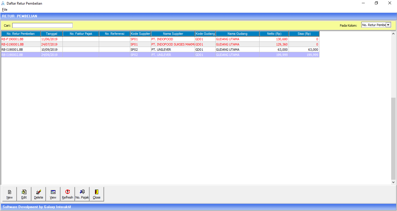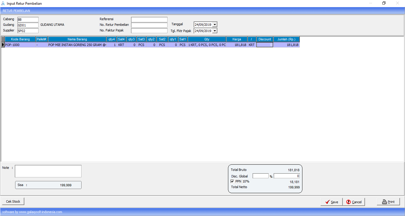 4. Lalu Klik save. Maka akan muncul jendela Master Retur Pembelian.