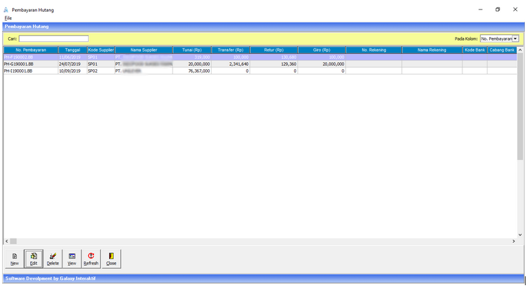 Pembayaran hutang ini dilakukan berdasarkan daftar bayar yang sudah dibuat sebelumnya ataupun tanpa mengambil daftar bayar dengan menarik langsung nomor pembelian, pembayarannya bisa dengan tunai, transfer maupun giro. Menu ini akan otomatis mengurangi hutang perusahaan kepada supplier, nah pada menu ini pula hutang akan berkurang jika mengambil nomo retur pembelian.