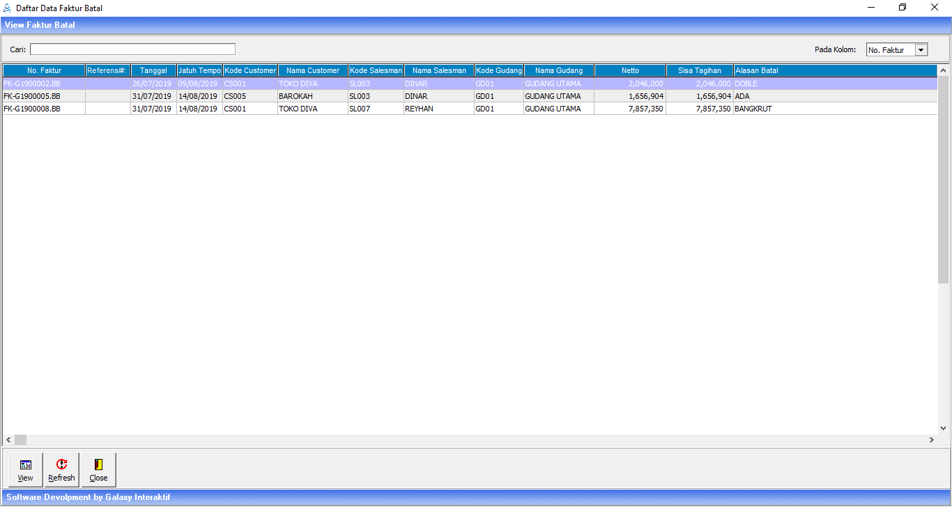 2. Faktur yang telah dibatalkan akan membatalkan jumlah piutang customer dan stok barang difaktur yang telah dibatalkan akan kembali kegudang.