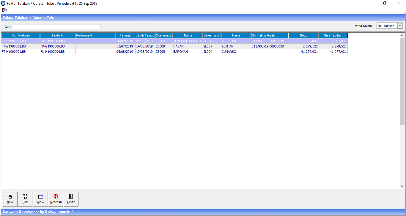 Menu Faktur tolakan ini fungsinya adalah untuk menginput faktur-faktur yang ditolak oleh customer secara langsung ketika barang tiba ditempat karena beberapa alasan, contoh ketika barang tiba saat dicek barang yang dibawa tidak sesuai pesanan dll.