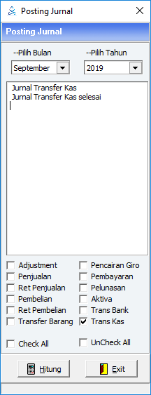 Jurnal Kas di hasilkan dari transaksi Kas Masuk dan Kas Keluar yang terdapat pada menu Kasir. Melalui menu Posting Jurnal -> Transaksi Kas. Setiap perubahan pada transaksi kas di menu kasir, maka jurnal kas ikut berubah.