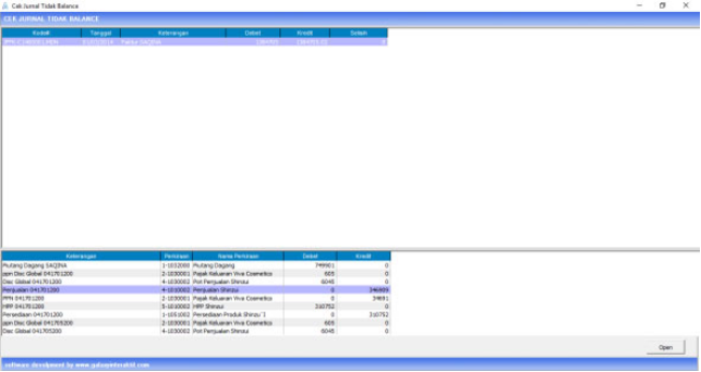 Menu ini digunakan untuk melakukan pengecekkan terhadap jurnal-jurnal yang tidak balance atau tidak seimbang, adanya menu ini memudahkan user dalam melakukan kontrol jurnal. Menu ini terdaapat pada Modul Accounting >> Cek Jurnal >> Cek Jurnal Tidak Balance.