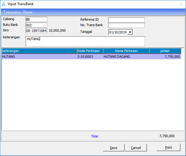 Giro | Klik 2x untuk mengambil kode giro jika data Bank Keluar tersebut menggunakan Buku Giro |