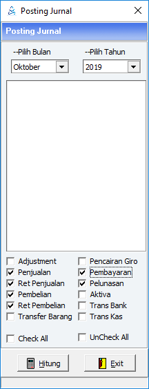 2. Tampil form posting jurnal, pilih periode (bulan/tahun) yang akan diposting dan checklist transaksi mana saja yang jurnalnya akan diposting.