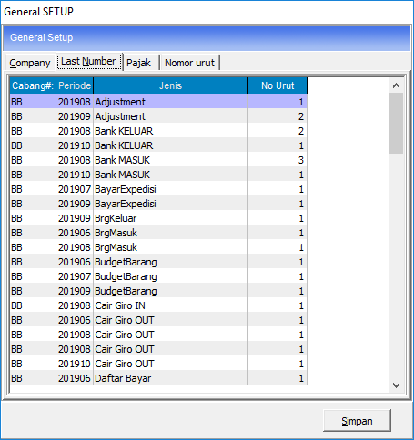 Tab ini berisi histori penggunaan nomor urut sesuai transaksi setiap periodenya. Misal periode 201905 baru dibuatkan 1 transaksi Faktur dengan nomor FK-E1900001.BB, maka nomor urut yang terakhir digunakan tsb adalah 1. Jika dibuatkan Faktur yang ke 2 maka nomor faktur FK-E1900002.BB, sehingga No. Urut untuk Faktur di tab Last Number akan muncul 2 untuk periode 201905. Last Number ini berlaku untuk semua transaksi yang ada di SEBAS.