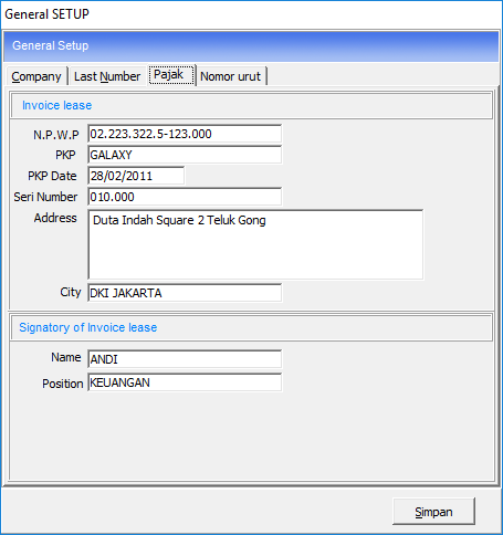 Tab ini berisi data pajak perusahaan, nantinya data ini digunakan pada laporan pajak maupun pada saat export E-Faktur.