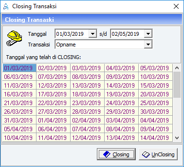ini digunakan untuk menutup data yang telah selesai dilakukan, misalkan data bulan lalu telah diperiksa dan telah benar maka lakukanlah proses closing transaksi. Transaksi tersebut ditutup berdasarkan tgl transaksi dan jenis transaksi.