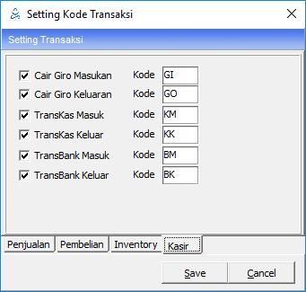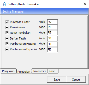 Menu Setting kode transaksi merupakan pengaturan kode untuk setiap transaksi seperti transaksi penjualan, pembelian, inventory, kasir, dan kanvas. Buka Modul Utility -> Setting Kode Transaksi. Terdapat beberapa tab yang harus di setting.