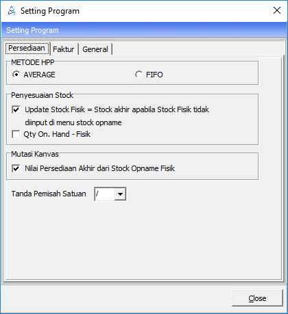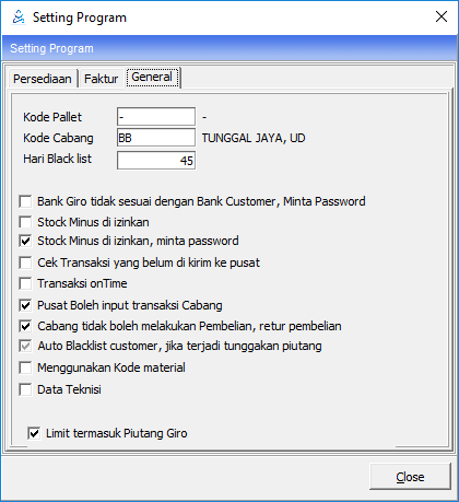 Menu ini digunakan untuk menampilkan settingan program, ini merupakan settingan awal sebelum dilakukannya transaksi sehingga untuk selanjutnya settingan ini tidak dapat diubah. Karena apabila diubah, akan merusak data maupun laporan yang sebelumnya telah dibuat. Buka Modul Utility >> Setting >> Setting Program. Cheklist atau tandai yang sesuai dengan settingan perusahaan inginkan. Setelah selesai, klik Save untuk menyimpan data.